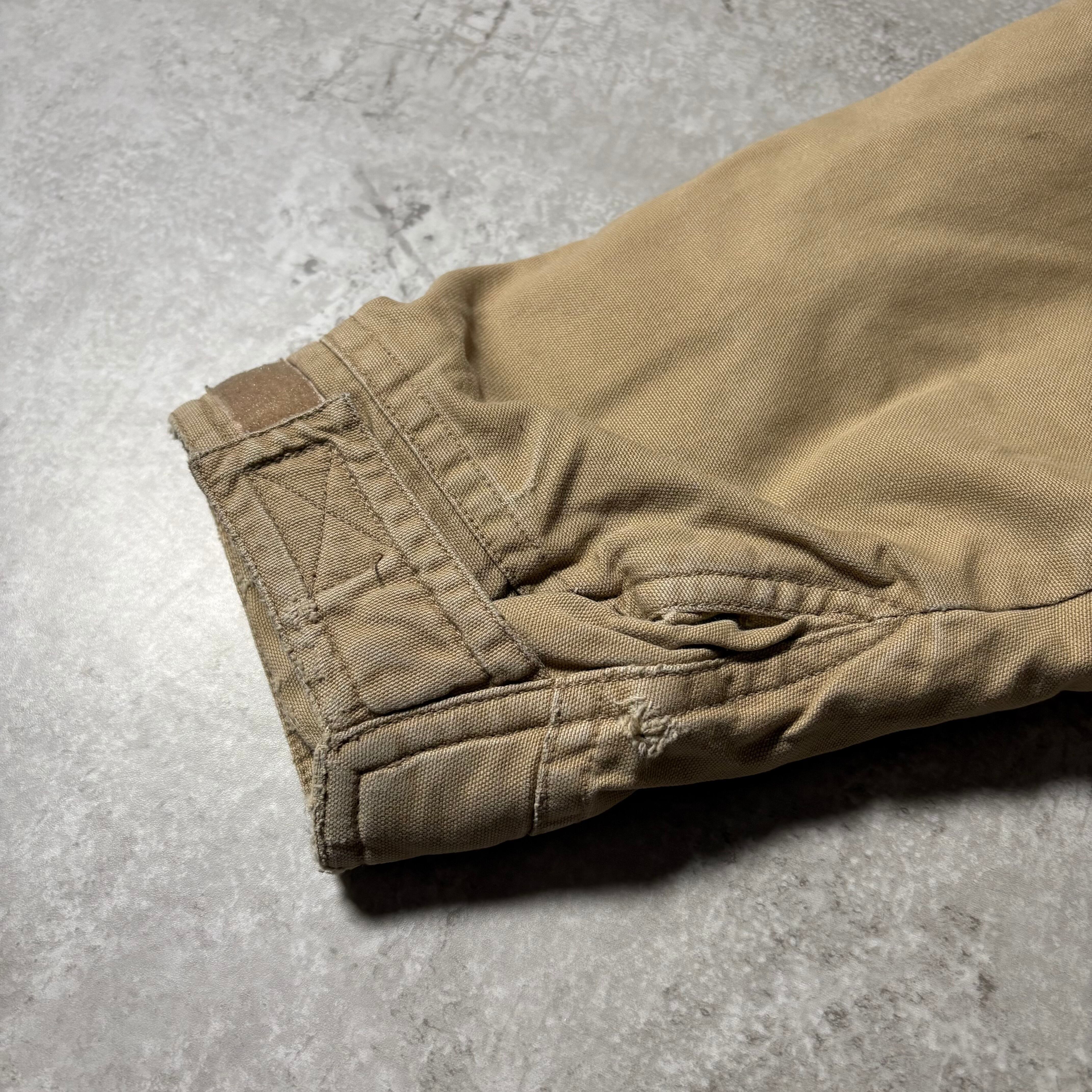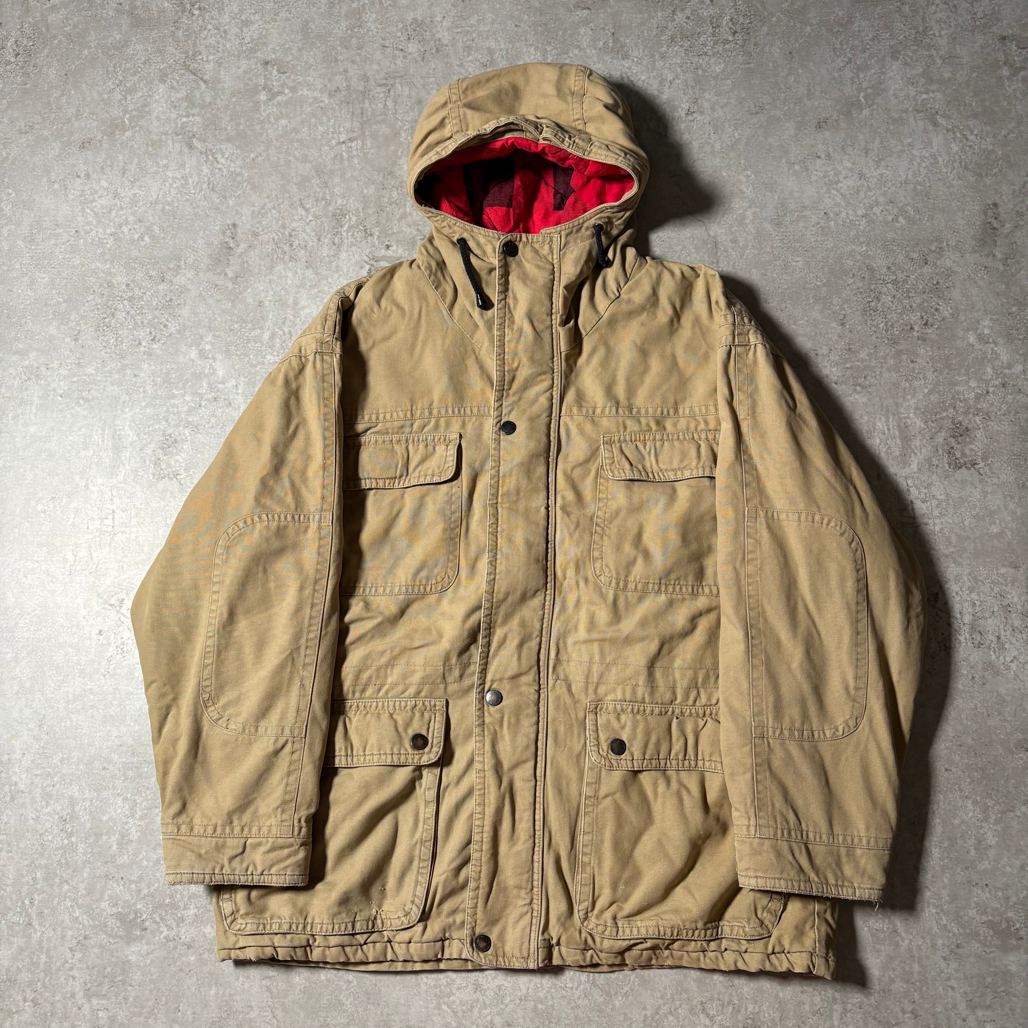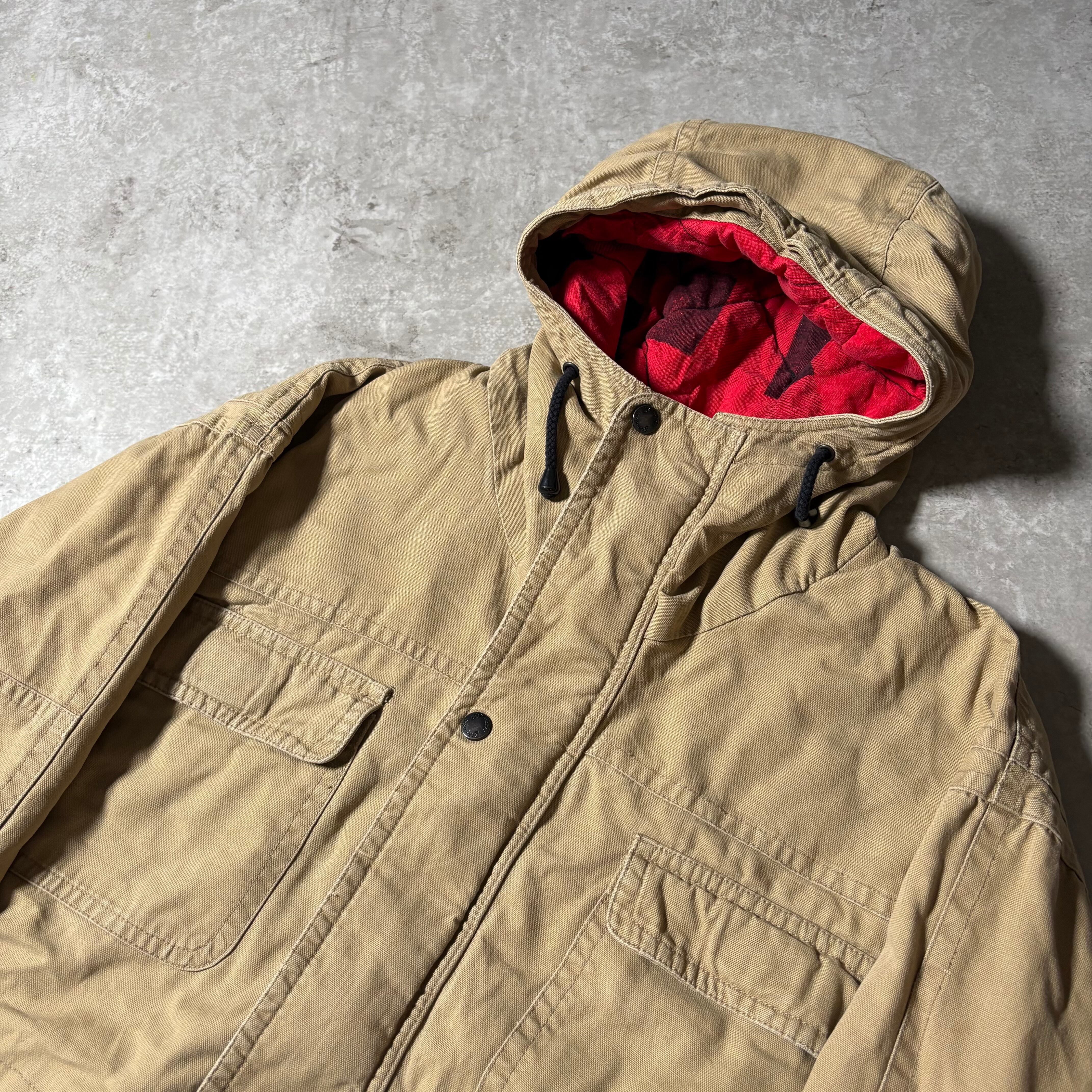 表地はタフなコットン系素材。裏地には赤×黒のネルライニングを配し、防寒性と視覚的なアクセントのある1着。