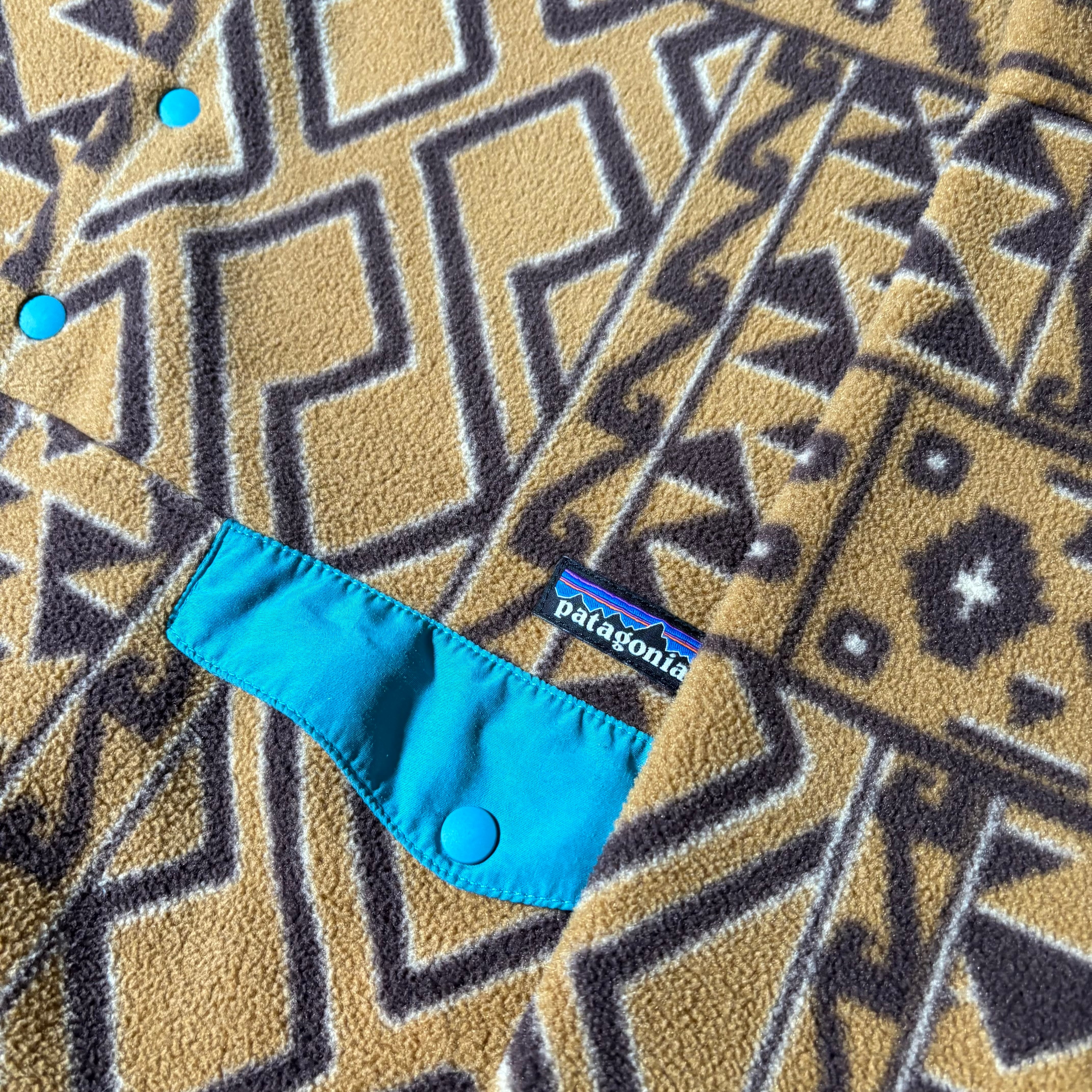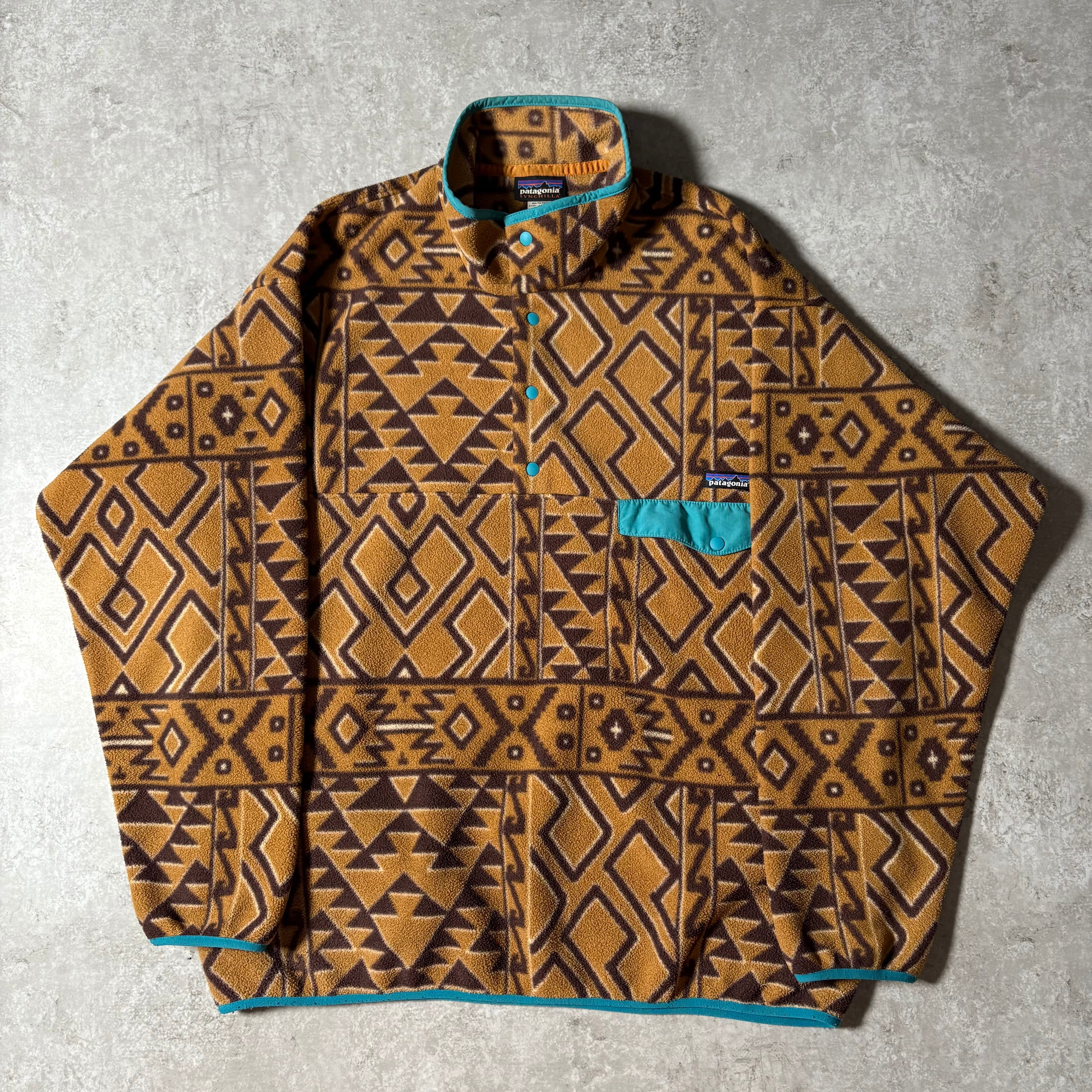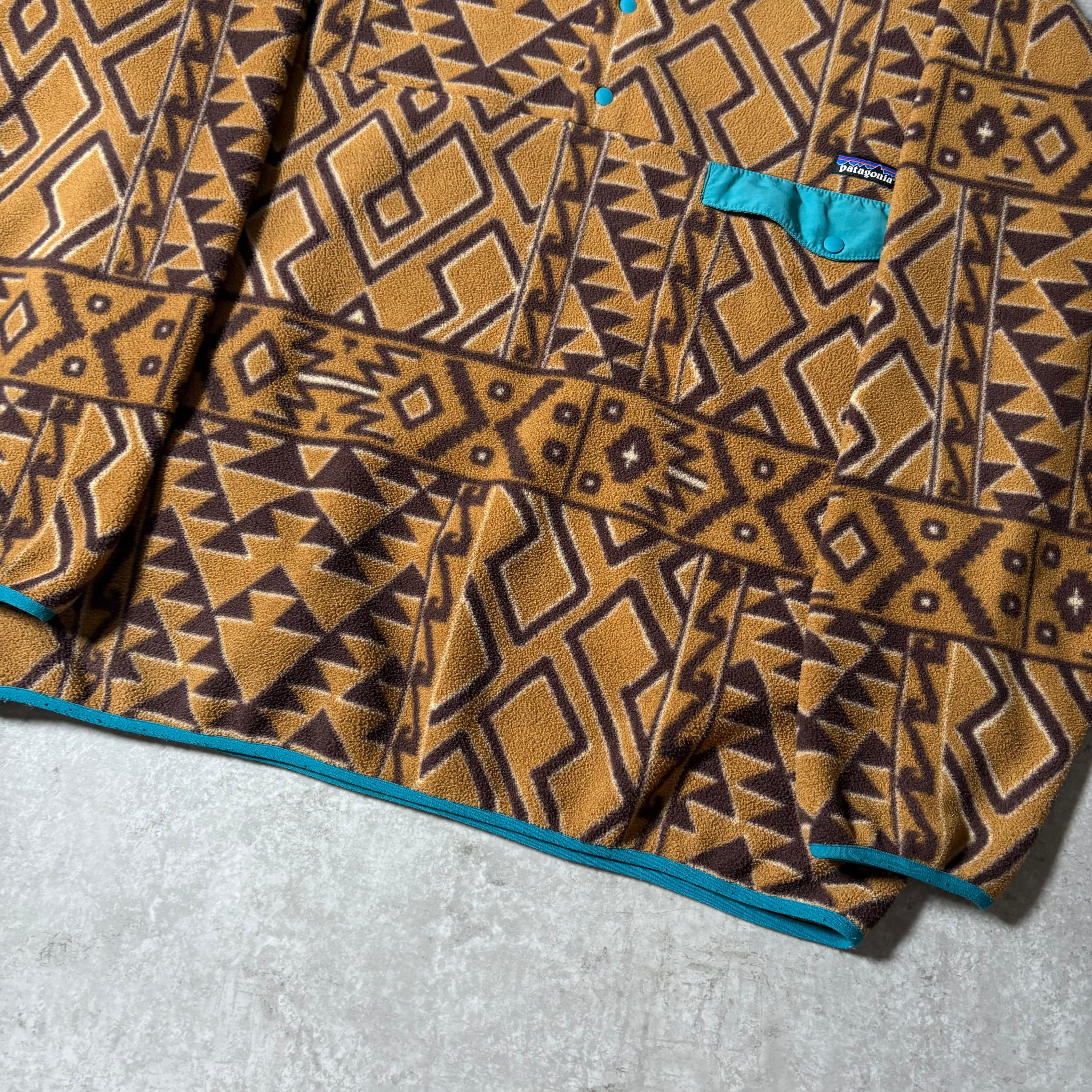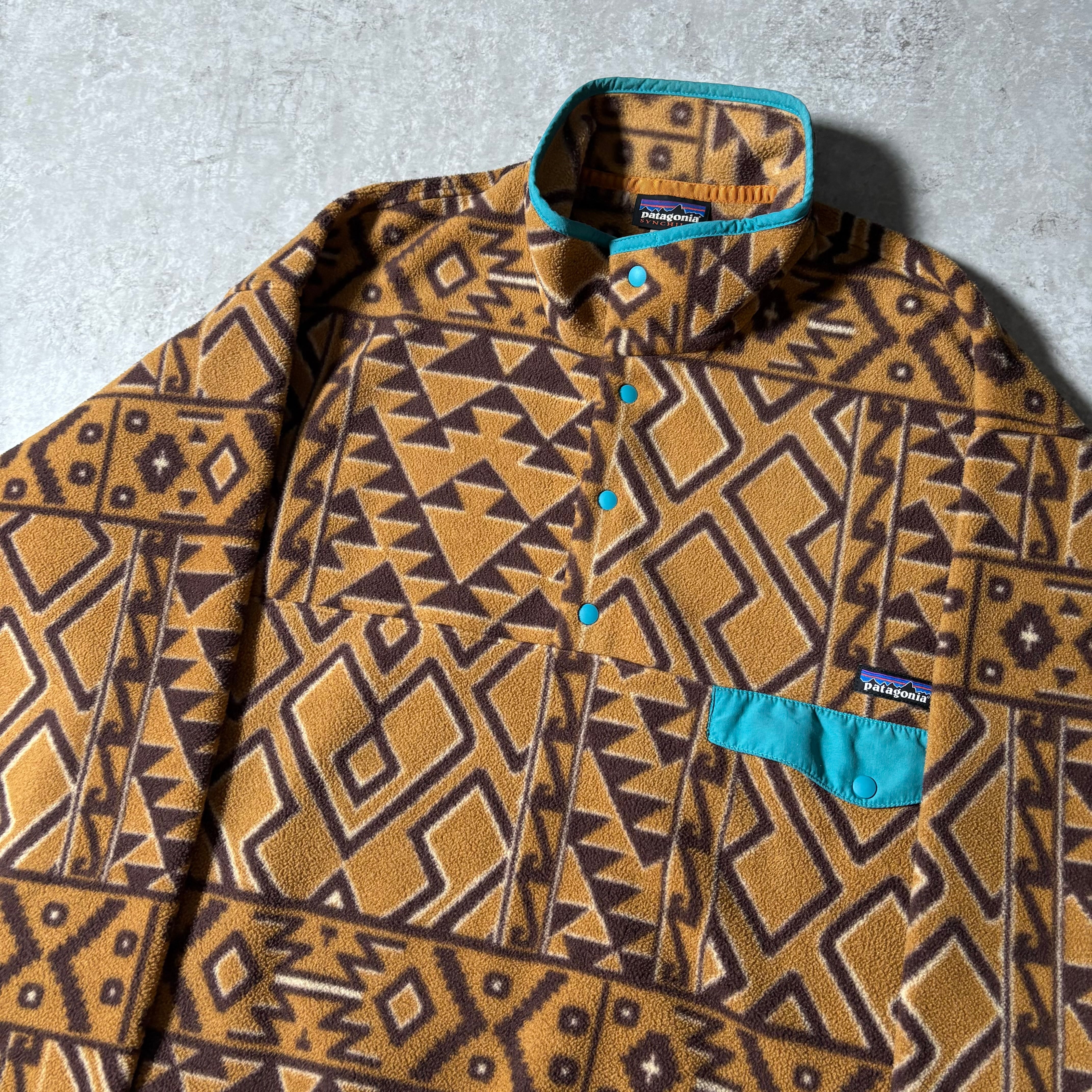 パタゴニアの定番、シンチラ・スナップT。こちらは総柄仕様の一着で、落ち着いた配色のネイティブ調パターンが最高です。