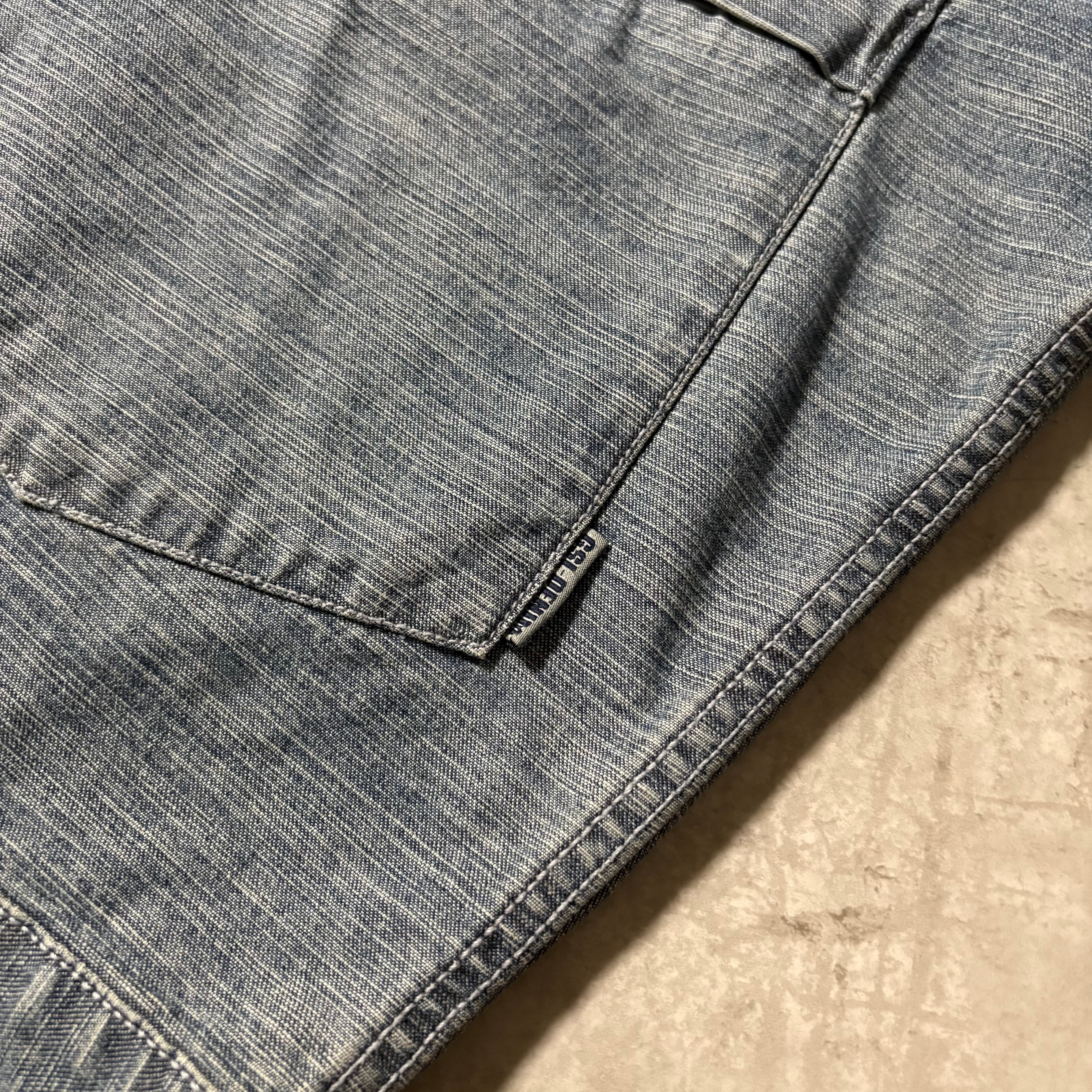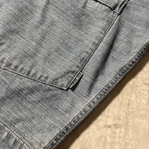 やや肉厚のデニム地で、洗いをかけたような淡いブルーの表情。