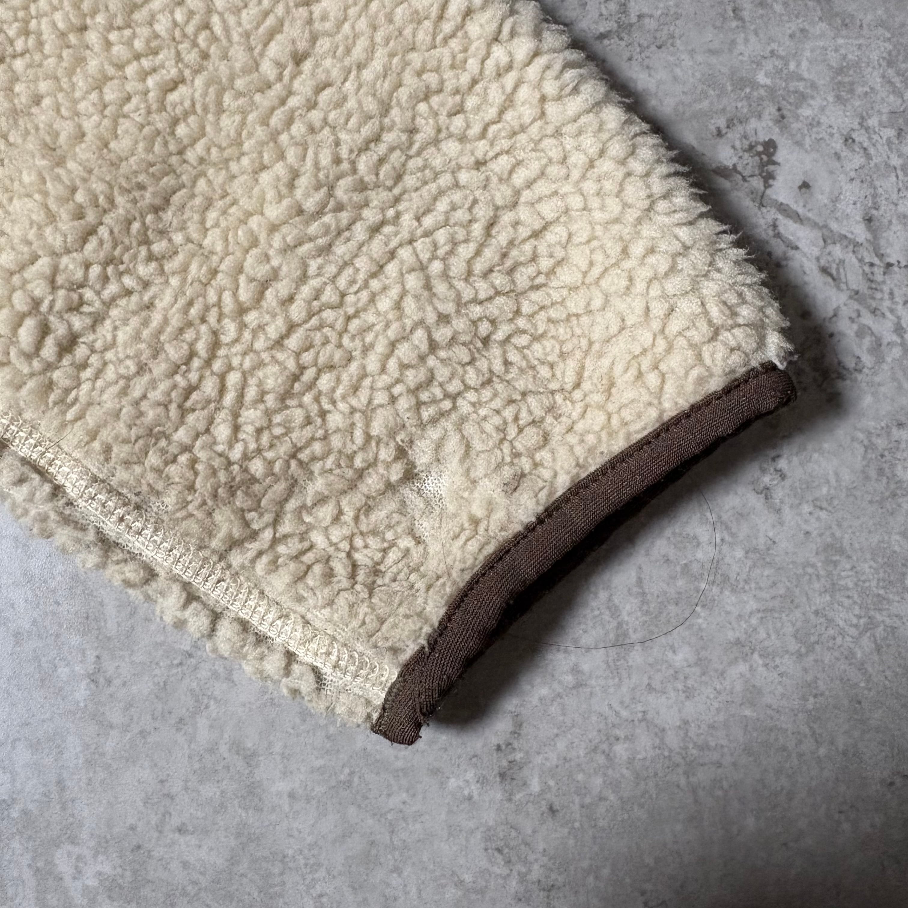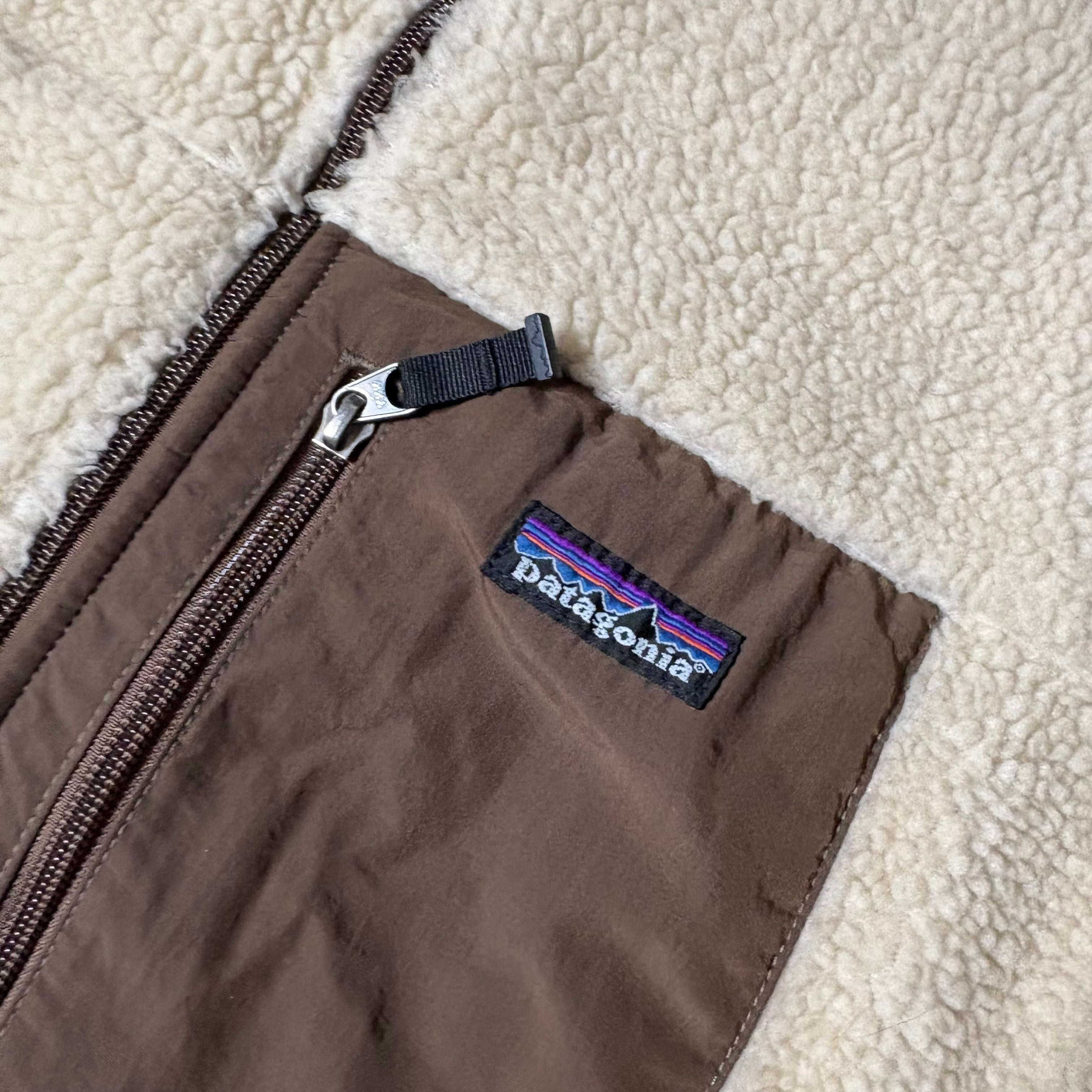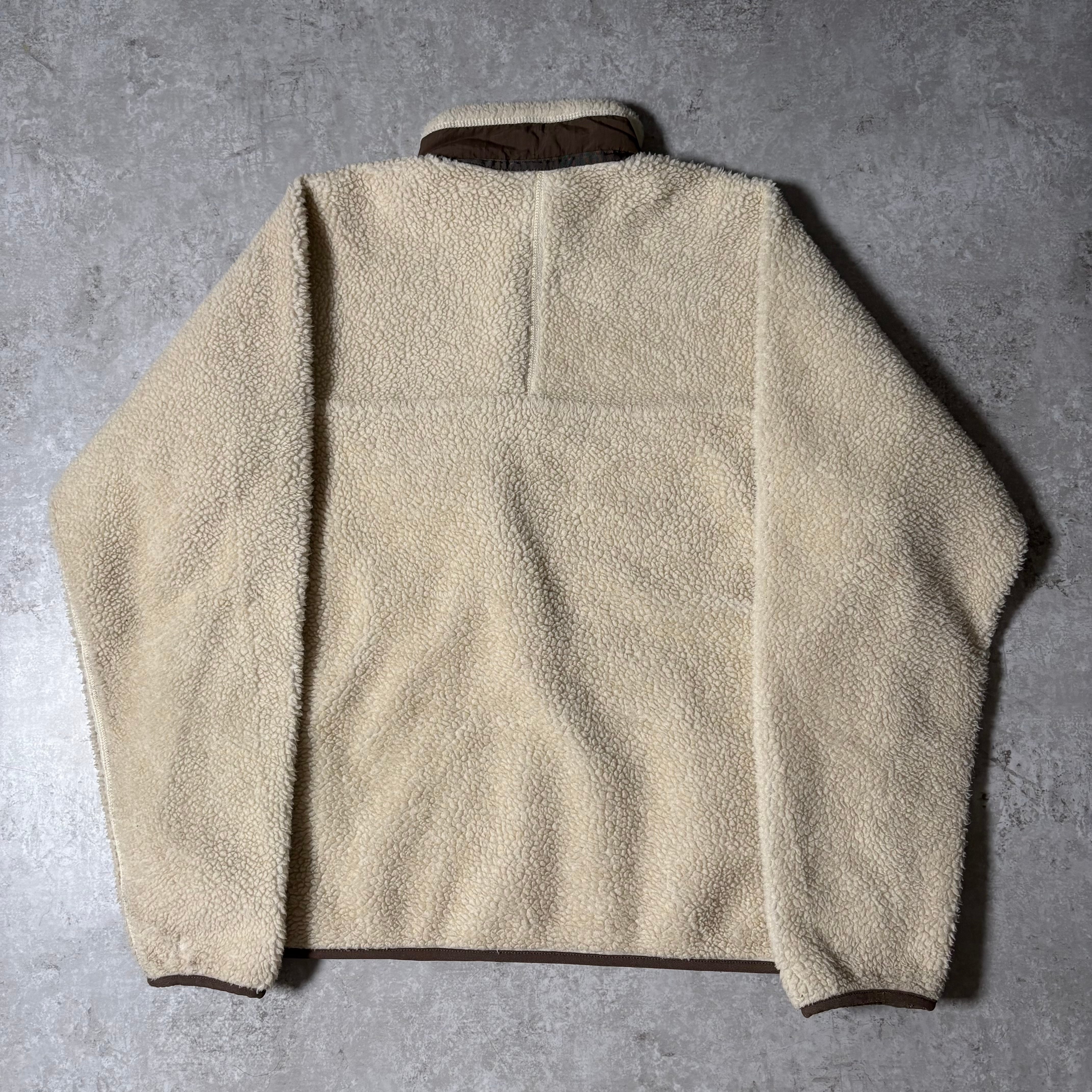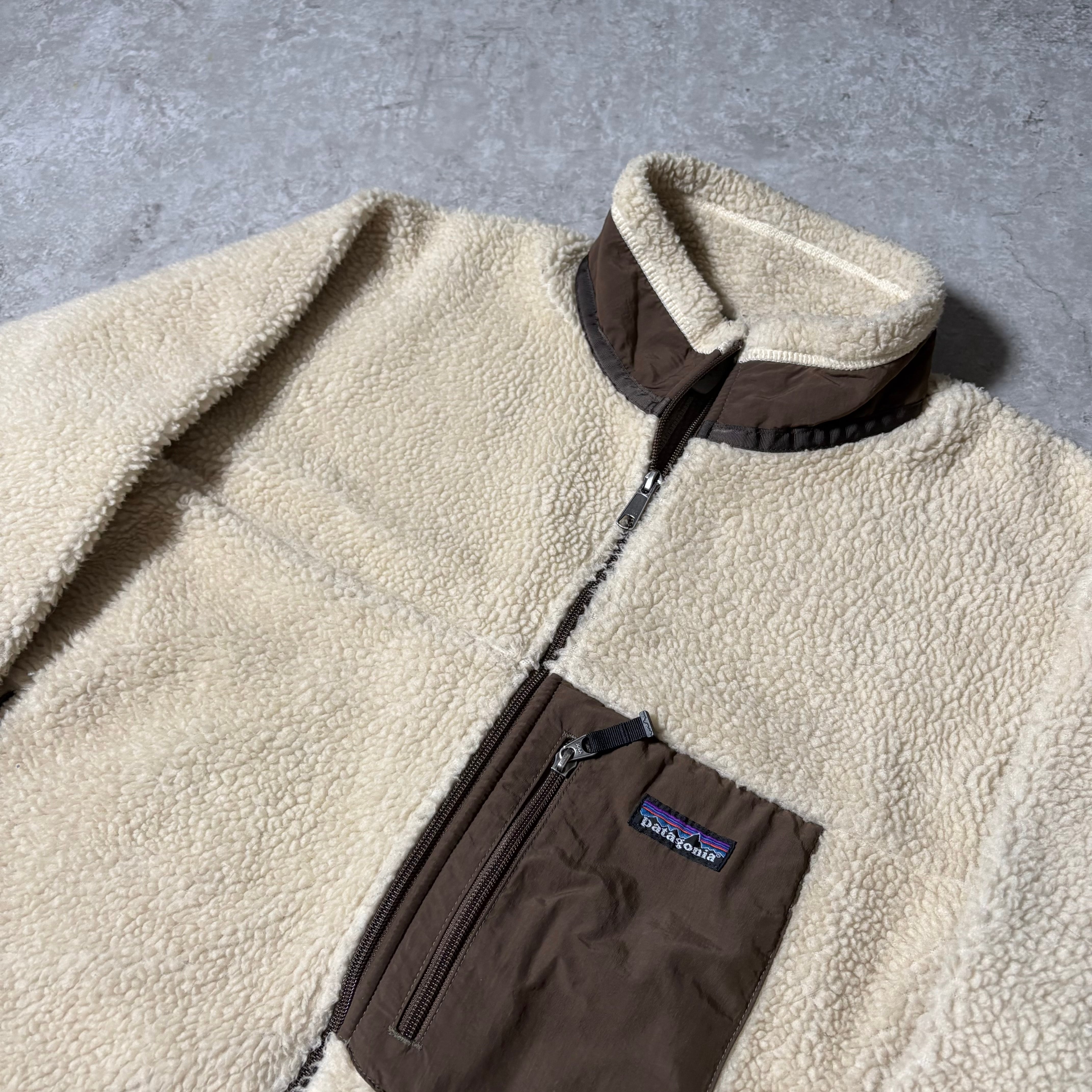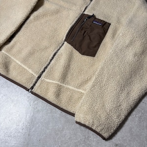 アイボリーのボディにブラウンの切り替えが入る、アウトドアらしい配色。Patagoniaらしい機能的なフリースジャケットです。