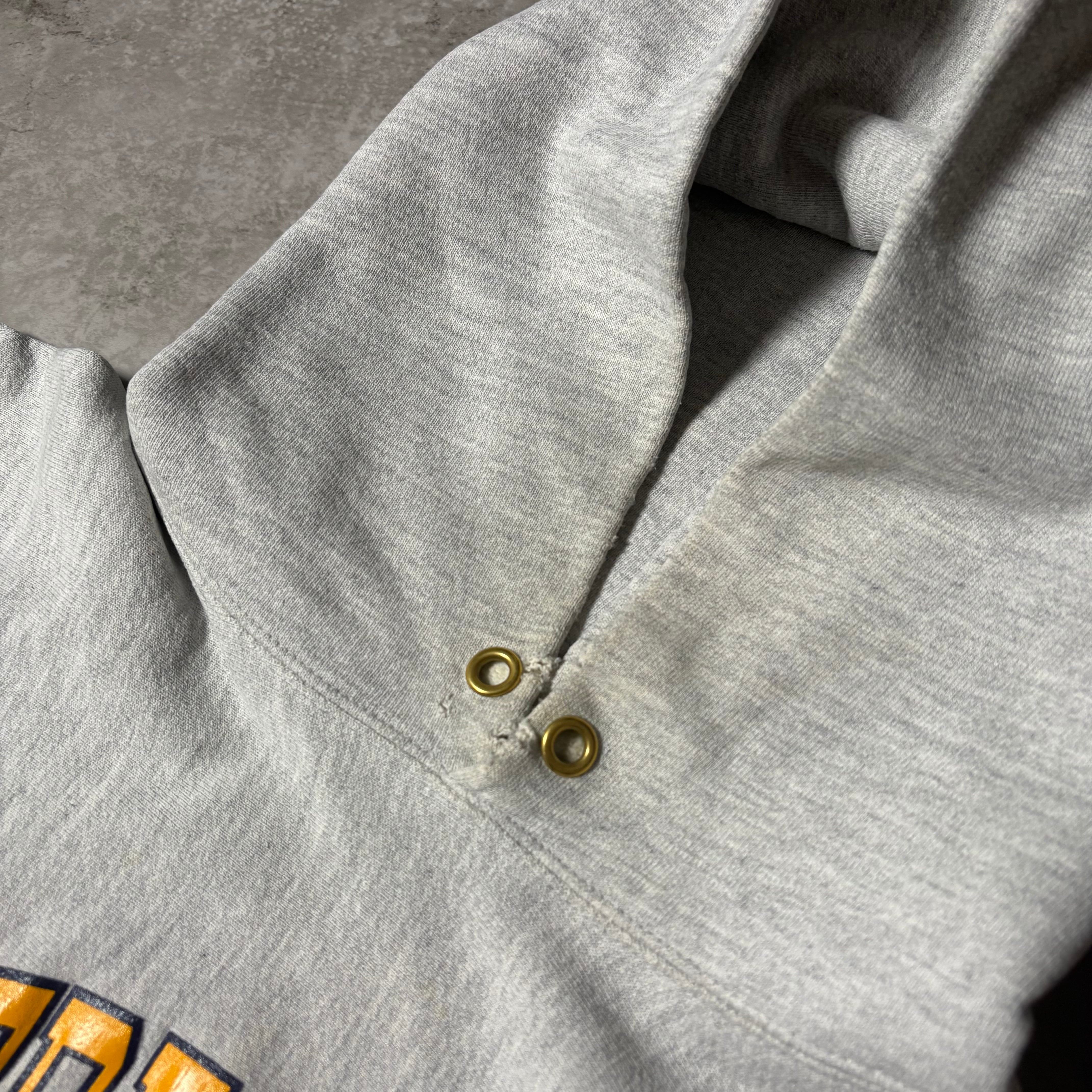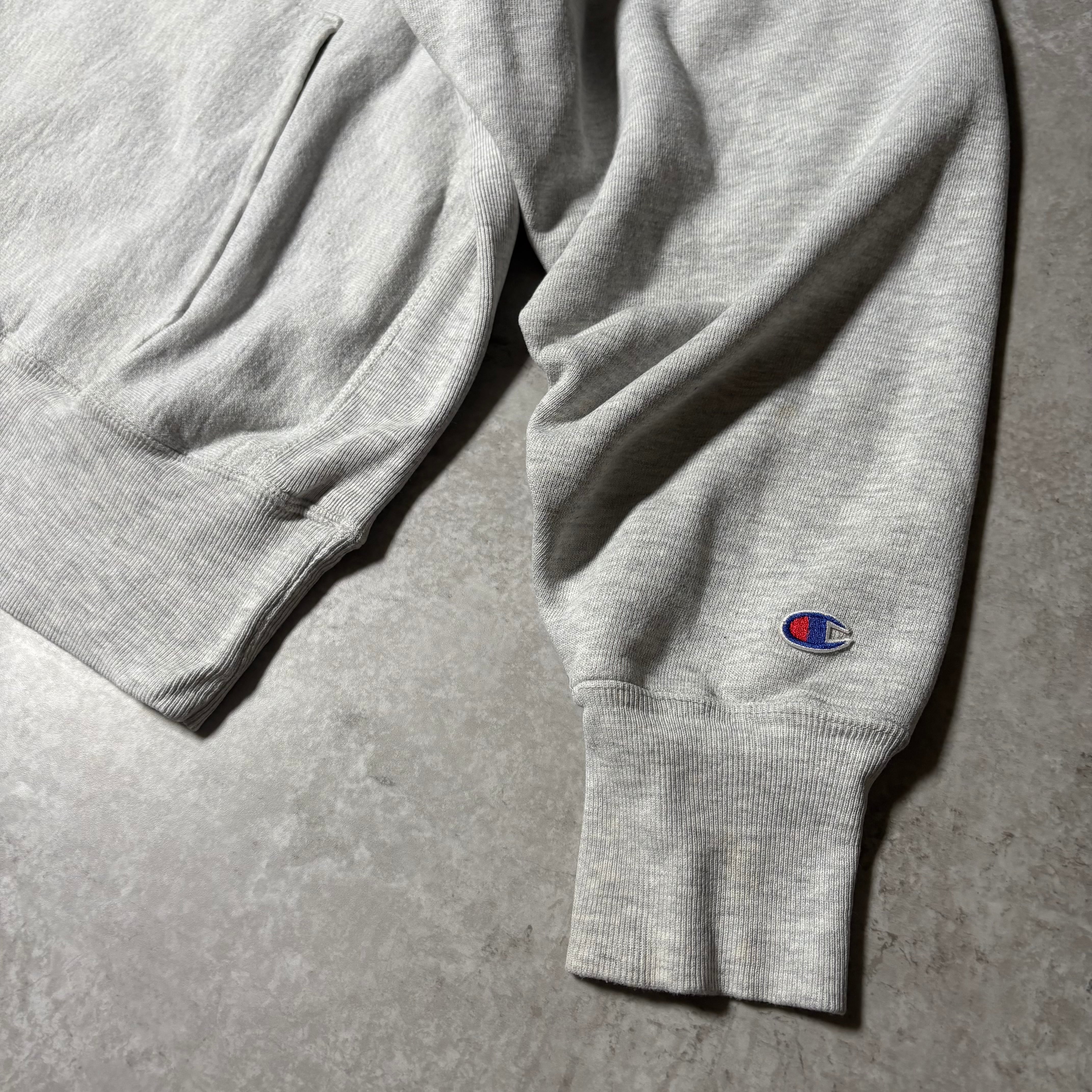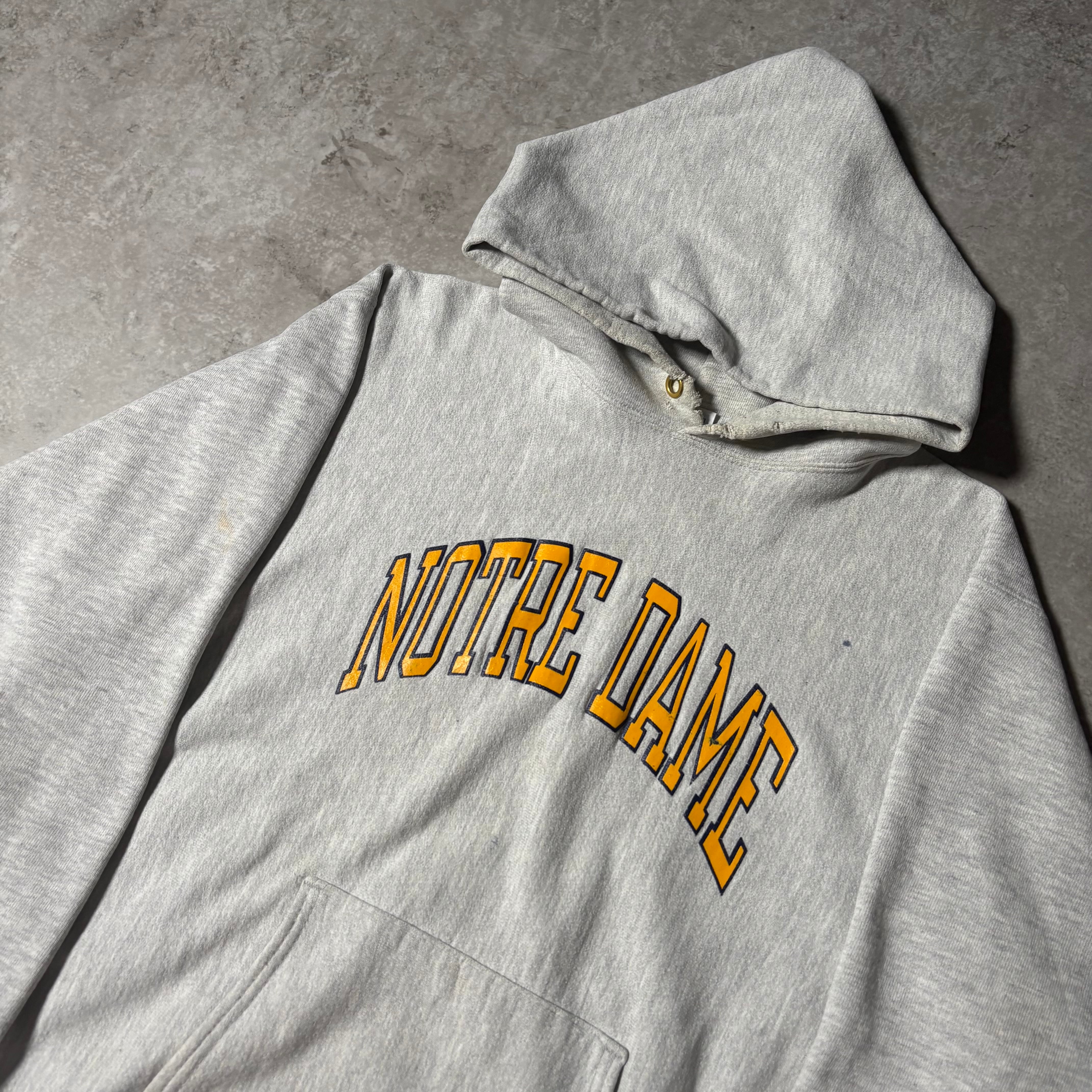 1990年代頃のChampionリバースウィーブフーディ。王道のグレーに、フロントにプリントされた“NOTRE DAME”のアーチプリントが映える一着。